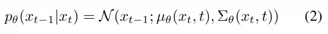 训练 DDPM 以反转公式 (1) 中的过程。反转过程通过一个「预测高斯分布参数 µ_θ(x_t, t)和Σ_θ(x_t, t)」的神经网络进行建模。具体如下公式 (2) 所示: