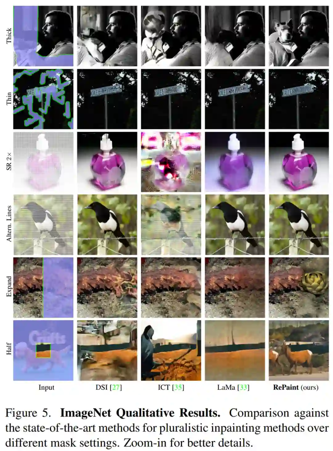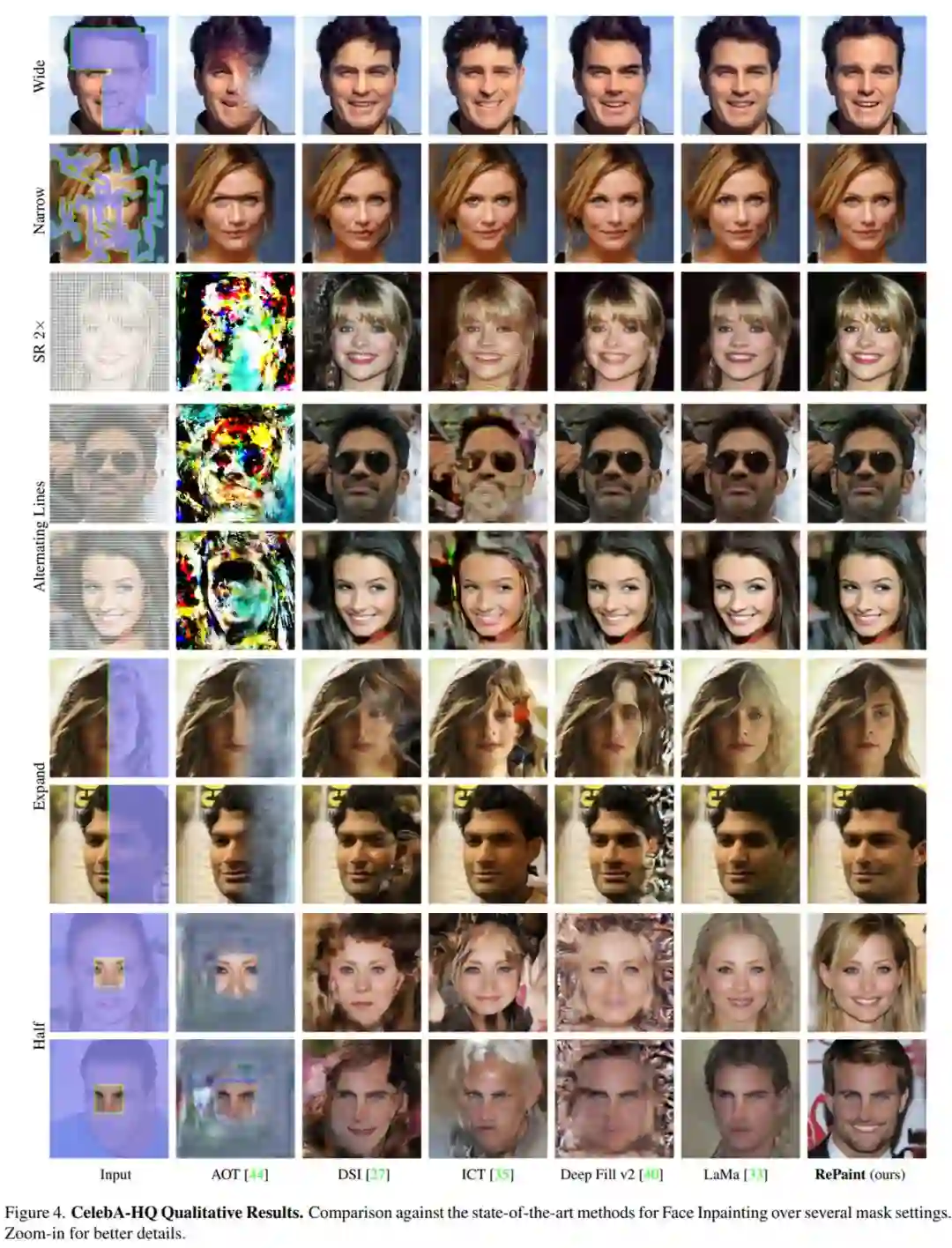 比较方法:该研究将 RePaint 与几种 SOTA 性能的基于自回归或基于 GAN 的方法进行比较。自回归方法包括 DSI 和 ICT,GAN 方法包括 DeepFillv2、AOT 和 LaMa。
