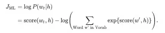 神经概率语言模型一般使用最大似然原则进行训练,其目标是要最大化在给定前面的单词 h(对于「history」)时的下一个单词 wt(对于「target」)的 softmax 概率