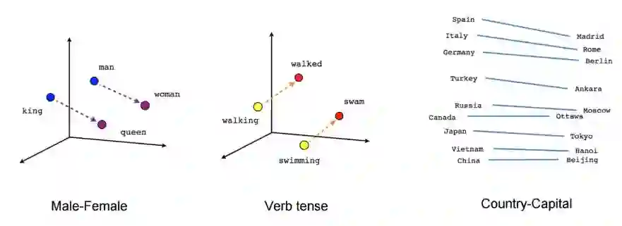 我们可以通过将它们向下投影到 2 维来可视化学习到的向量。当我们观察这些可视化时,很明显这些向量捕获到了一些关于单词的语义信息以及词与词之间的关系,这在实际中是非常有用的。