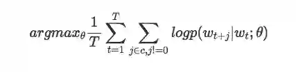这个等式的主要含义是,在当前单词的一定窗口范围 c 内出现的单词 wt 存在一定的概率 p。这个概率同当前词 wt 和我们设定的参数 theta 相关。我们希望设定的参数 theta 可以最大化整个语料库的上述概率。