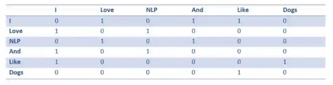 通过这个简单的矩阵,我们能够获得非常有用的信息。例如,「love」和「like」这两个词对名词(NLP 和 dogs)的计数都是 1。他们对「I」的计数也是 1,这表明这些词很可能是某种动词。对于远比一个句子更大的数据集,可以预料的是这种相似性会体现得更加清晰,因为「like」、」love」和其他具有相似上下文的同义词将开始具有相似的向量表示。