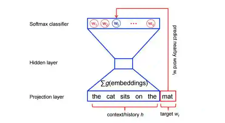 预测模型直接尝试根据学习到的近邻单词的小密集嵌入向量(考虑模型的参数)来预测单词。