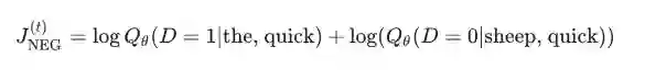 为了简单起见,我们设定 num_noise = 1,我们选择 sheep 作为一个噪声样本。接下来我们计算这对观察到的和有噪声的例子的损失,即在」t」时刻的目标函数变成: