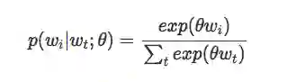 基本的 skip-gram 模型定义了经过 softmax 函数计算的概率 p。如果我们的词汇表中有 N 个词,而我们希望学习的嵌入向量的维度为 k,那么我们可以设定 wi 是 N 维的 ont-hot 向量,theta 是一个 N×K 的嵌入矩阵,从而有: