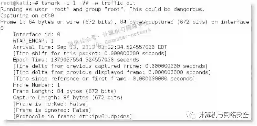 部署一个数据包嗅探器来映射流量将会帮助你识别主机名、活跃子网和域名。如果DHCP地址没有启用,它也将允许攻击者确定任何未使用的、静态的IP地址。Kail预先配置使用Wireshark(基于GUI的数据包嗅探器),但是你可以在一个后期利用脚本中,或者在命令行使用tshark,如下图所示。
