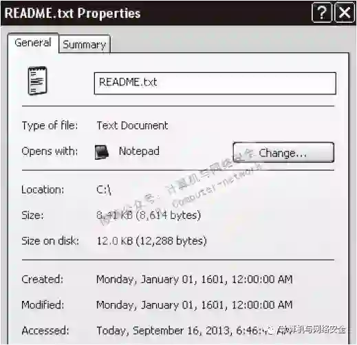 这种变化会引起调查者的注意,但他们也无法利用该数据进行取证分析。来自于原始Windows平台的属性看起来是什么样的?如果一个系统管理员调用一个文件的系统属性,但是文件的创建和修改时间已经被改为了1601年(这个时间被Microsoft作为初始系统启动的时间),与此相反,文件的上次访问时仍然是正确的,如下图所示。