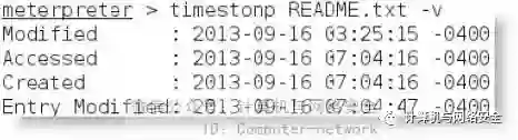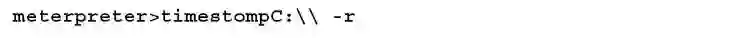 Metasploit有一个绝招,那就是timestomp选项,它允许攻击者更改一个文件的MACE参数(一个文件的最后一次修改、访问、创建,以及MFT入口修改时间)。一旦系统被入侵,并且一个meterpreter shell已经建立,timestomp就会被调用,如下图所示。
