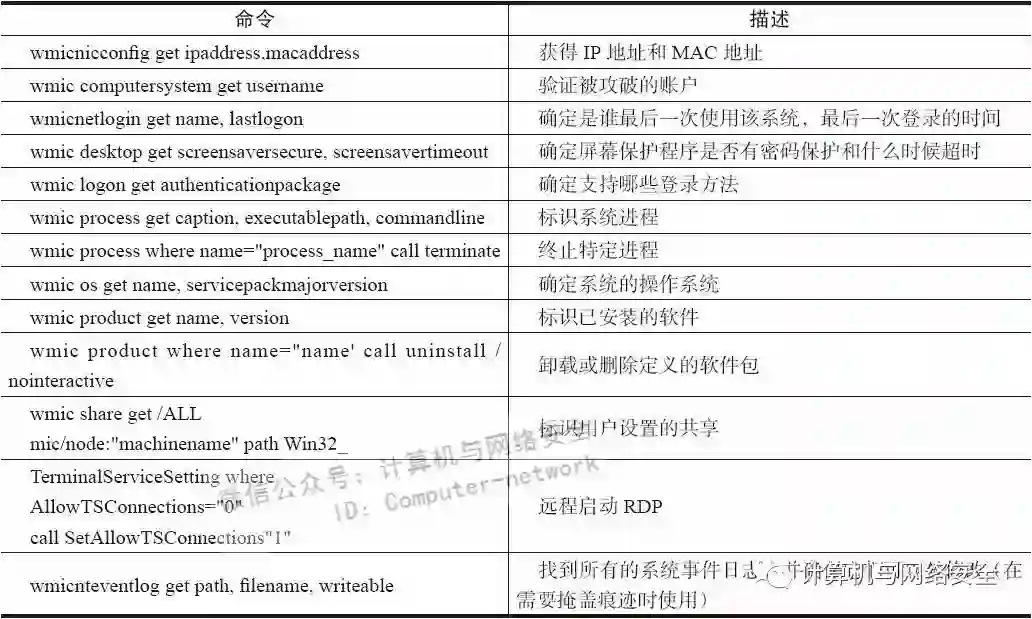 针对新的目标系统,攻击者和渗透测试人员利用内置的脚本语言。例如,Windows设备管理命令行(Windows Management Instrumentation Command-line,WMIC),通过使用命令行和脚本界面来简化访问Windows配置。如果被渗透系统支持WMIC,可以通过一些命令来收集信息。请参见下表。