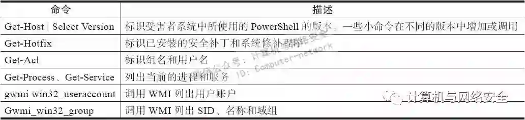 PowerShell是一种支持复杂操作的脚本语言,建议用户花时间来熟悉它的使用。一些较简单的、可以立即展示结果的命令见下表。