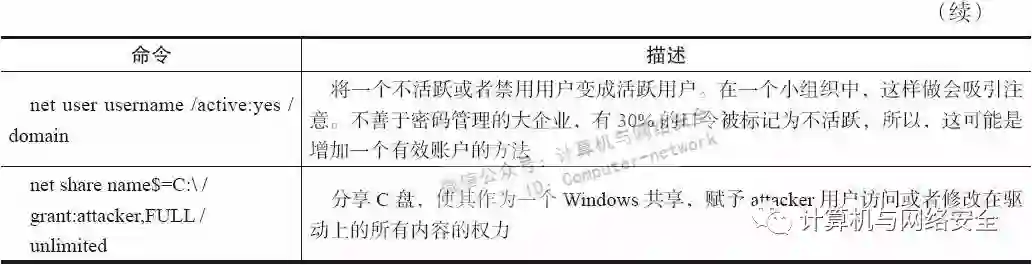 下面的命令是具有高度侵略性的,通常会被系统拥有者在应急响应程序中检测到。然而,它们会频繁地被一个攻击者采用,以此来转移对更持久的访问机制的注意,相关的命令参见下表。