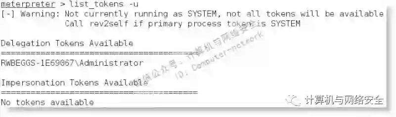 第一步是确定被感染系统上存在的所有有效的令牌。你可以看到令牌的个数,取决于你最初入侵目标系统所使用的访问级别。