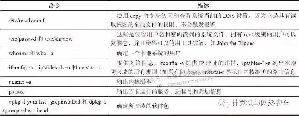 如果被入侵的系统是基于UNIX平台的,典型的本地侦察命令见下表。