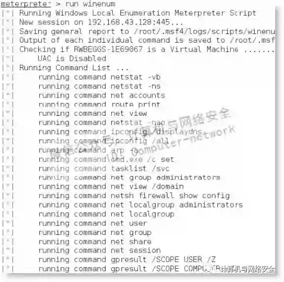 Windows enumerator(winenum)是最有效的meterpreter脚本之一。如下图所示,它同时使用命令行和WMIC来获得目标系统的全面表征。