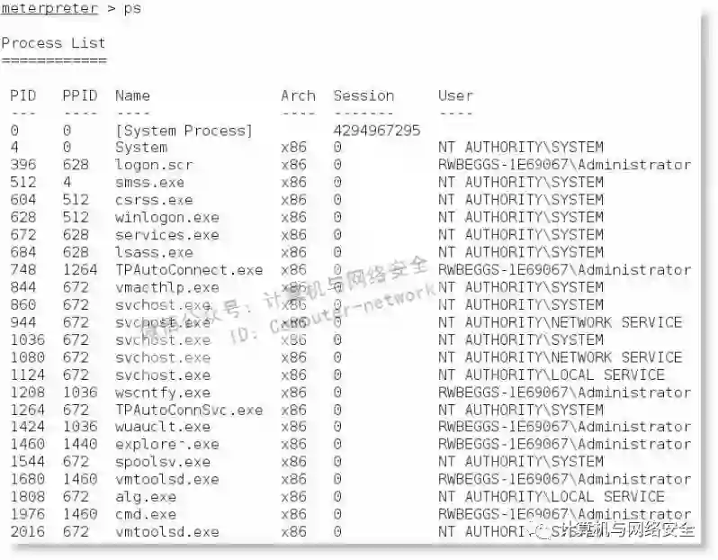 在meterpreter的提示下,输入ps来获得一系列的运行进程,如下图所示。