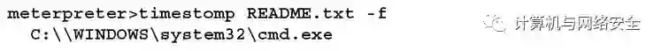 如果我们想隐藏这个文件,我们可以将其移动到一个杂乱的目录,如Windows\System32下。但是,这个文件对于那些根据创建时间或其他MAC参数进行排序的人,是显而易见的。因此,使用下面的命令,将cmd.exe文件中的MAC信息复制到README.txt文件中。