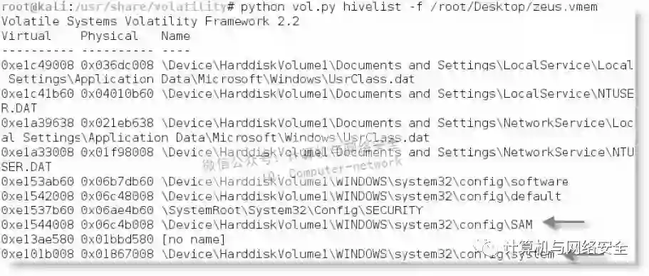 当执行下列命令时,hivelist插件将对不同的hives注册表打印出初始的虚拟内存位置: