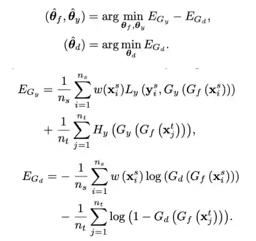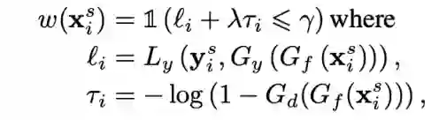 具体地,把课程学习中给给不同数据不同权重的方法用在一开始介绍的对抗学习标准模版上即可(标准模版是指上文的公式 (1) - (4))。那么这么做的主要难点就是如何设置权重更新,找到源数据集中容易迁移到目标数据集的数据。