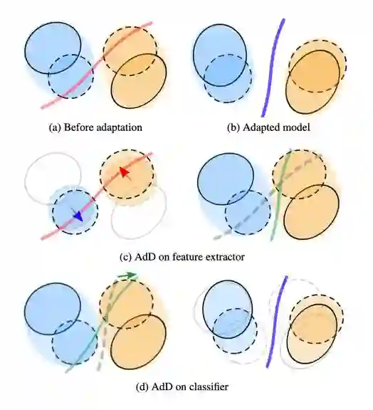 具体地,下图里实线代表了源数据集,虚线代表了目标数据集,(a) 图是不做领域适应的结果,很明显,决策边界直接穿过了目标领域,(b) 图是做了领域适应的结果,主要是对特征提取器和分类器做了 dropout。