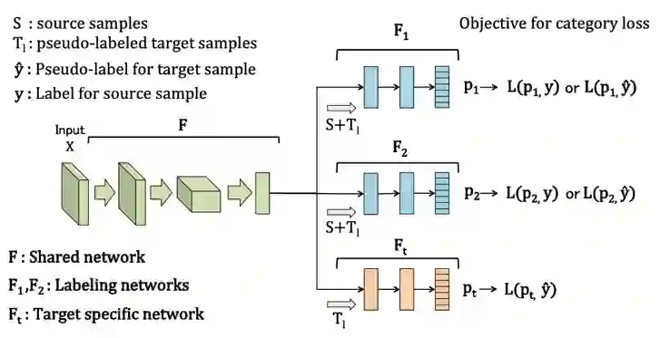 这篇论文放弃了对抗训练的思想,而是引入了伪标签的方法来打分。相比直接打伪标签的方法,这篇论文使用了两个网络来一起打伪标签,只把目标数据集中两个网络给相同预测标签的数据(并且其预测标签概率大于一定阈值,例如0.9)拿出来训练目标数据集的分类器。