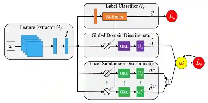 这是一篇典型的对判别器做修改的论文。作者在原有的源-目标判别器(source-target domain discriminator)的基础上加入了局部领域判别器(local subdomain discriminator)。