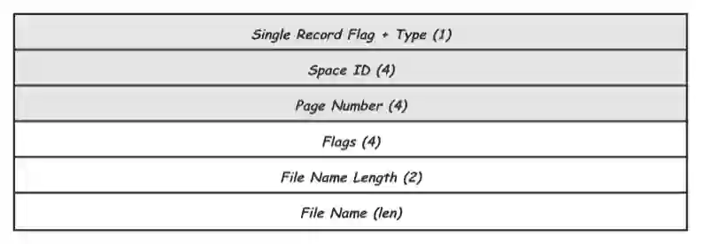 同样的前三个字段还是Type,Space ID和Page Number,由于是针对Page的操作,这里的Page Number永远是0。在此之后记录了创建的文件flag以及文件名,用作重启恢复时的检查。