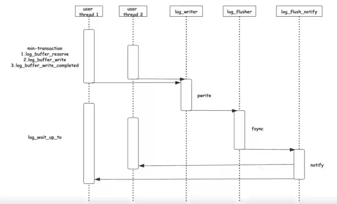多个线程通过一些内部数据结构的辅助,完成了高效的从REDO产生,到REDO写盘,再到唤醒用户线程的流程,下面是整个这个过程的时序图: