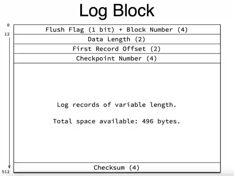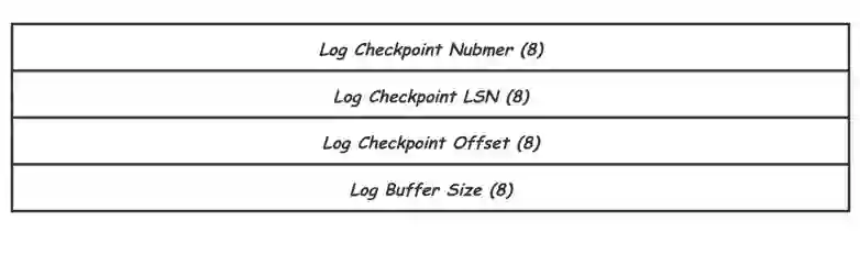 首先8个字节的Checkpoint Number,通过比较这个值可以判断哪个是最新的Checkpiont记录,之后8字节的Checkpoint LSN为打Checkpoint的REDO位置,恢复时会从这个位置开始重放后边的REDO。之后8个字节的Checkpoint Offset,将Checkpoint LSN与文件空间的偏移对应起来。最后8字节是前面提到的Log Buffer的长度,这个值目前在恢复过程并没有使用。
