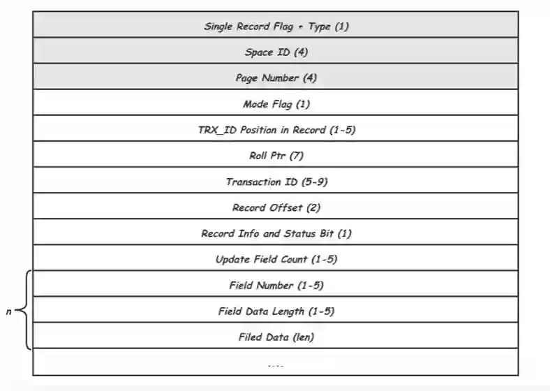 其中,PageID指定要操作的Page页,Record Offset记录了Record在Page内的偏移位置,后面的Field数组,记录了需要修改的Field以及修改后的Value。