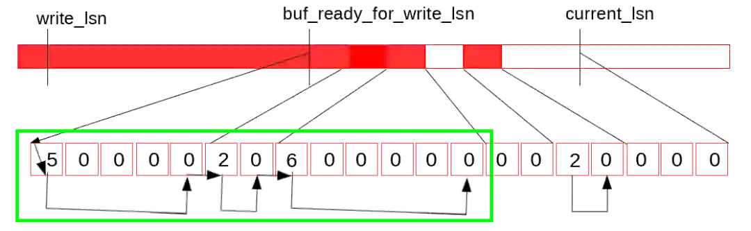 link_buf是一个循环使用的数组,对每个lsn取模可以得到其在link_buf上的一个槽位,在这个槽位中记录REDO长度。另外一个线程从开始遍历这个link_buf,通过槽位中的长度可以找到这条REDO的结尾位置,一直遍历到下一位置为0的位置,可以认为之后的REDO有空洞,而之前已经连续,这个位置叫做link_buf的tail。下面看看log_writer和众多mtr是如何利用这个link_buf数据结构的。这里的这个link_buf为log.recent_written,如下图所示:
