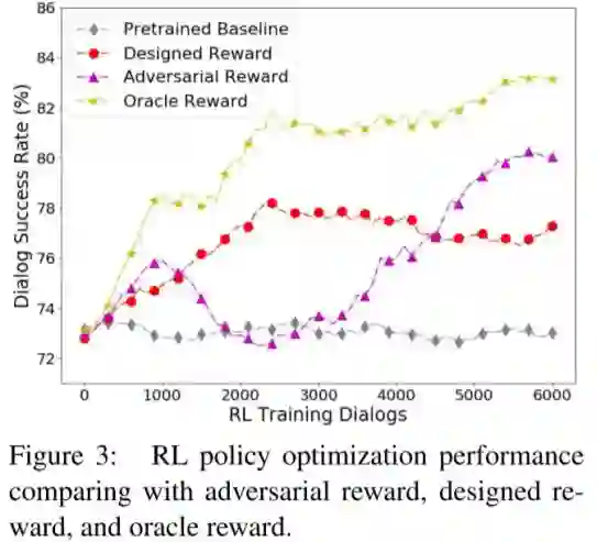 作者使用别的奖励函数作为对比,如 Oracle reward,Designed Reward. Pretrained Baseline等,并使用对话成功率作为指标。对比结果如下所示,可见对抗奖励函数在训练轮数较少的情况下优势不大,但是最终还是超过了大多数方法,也超过了baseline的方法7.4%的百分点。但是缺点还是显而易见的,虽然在最后结果还算不错,但是在训练的过程中,方差较大,表现的不稳定,极端时候甚至略差于baseline。这是因为在强化学习的训练过程中,agent的目标在不断改变。当agent和判别器都逐渐趋于收敛时,模型也就稳定了。