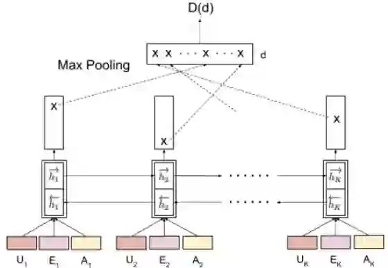 首先将对话过程中每一轮的用户的话,系统中检索到的结果,系统的回复输入到一个双向LSTM中,并取结果中的LSTM最终输出、max-pooling(将输出向量中每一维最大的拼接起来),Average-pooling(输出向量每一维的平均),attention(每一维按照计算得到的attention加权)等方式组成最后的输出向量,判别最后的结果。