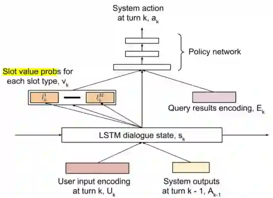 在生成隐层状态之后,可以对它进行进一步计算,得到用户的目标的表示(Slot Value)。以订餐的任务而言,slot 的类型可以是“菜系”、“地点”、“时间”等。如“五道口东来顺,今天六点,两个人的位子”就可以提取出(place=五道口),(restaurant=东来顺),(time=6pm)等slot-value对。除此之外,生成回答时,还需要从额外的数据库中查找对应的信息,如订餐的任务,首先要查找该餐馆对应时间还有没有空余的座位等,查询的结果经过编码之后,用表示。将slot value
