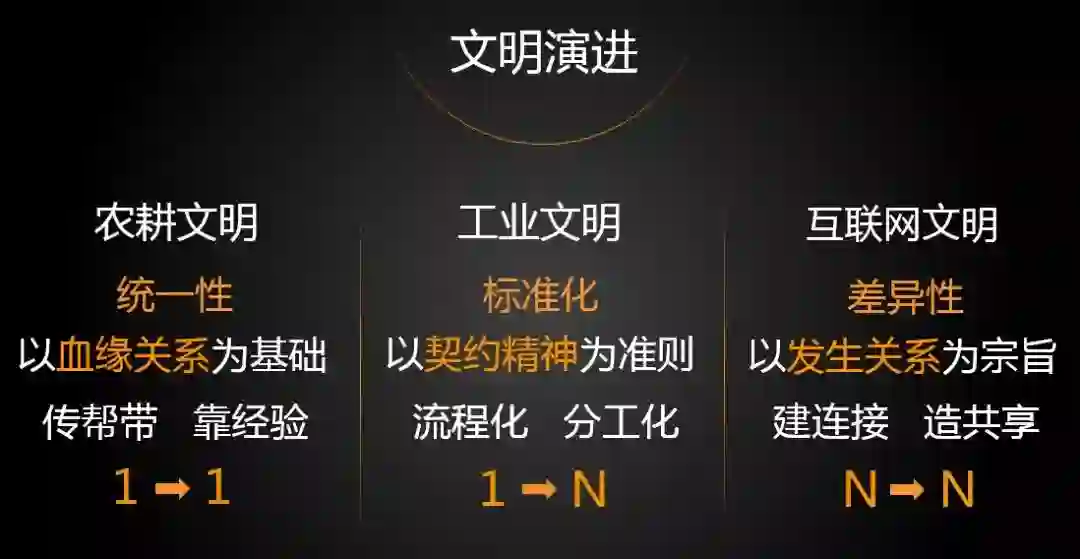 第三阶段相当于互联网文明。企业发展强调发生关系的逻辑,在各个单元之间制造连接。从订单逻辑看,农耕文明属于加减法逻辑,订单需一个一个积累;工业文明属于乘除法逻辑,订单流程协同,整体效率更高;互联网文明属于N次方逻辑。