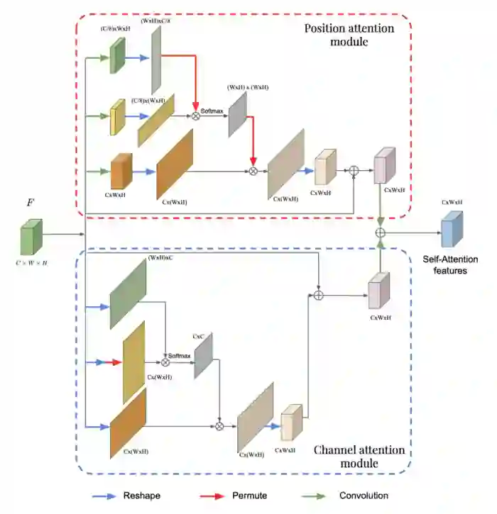 在每个block中,需要注意的是,最上面的两个分支负责提取具体的注意力分布。例如,在位置注意力模块中,我们有一个(WH)x(WH)的注意力分布,其中*(i, j)元素表示位置i对位置j*的影响有多大。在通道块中,我们有一个CxC注意力分布,它告诉我们一个通道对另一个的影响有多大。在每个模块的第三个分支中,将这个特定的注意分布乘以输入的变换,得到通道或位置的注意力分布。如前一篇文章所述,在给定多尺度特征的背景下,将注意力分布乘以输入来提取输入的相关信息。然后对这两个模块的输出进行逐元素的相加,给出最终的自注意力特征。现在,让我们看看如何在全局框架中使用这两个模块的输出。