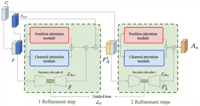 引导注意力为每个尺度建立一个连续的多个细化步骤(在提出的结构中有4个尺度)。输入特征图被送至位置和通道输出模块,输出单个特征图。它还通过了一个自动编码器,该编码器对输入进行重建。在每个block中,注意力图是由这两个输出相乘产生的。然后将此注意力图与之前生成的多尺度特征图相乘。因此,输出表示了我们需要关注特定的尺度的哪个部分。然后,通过将一个block的输出与多尺度的注意力图连接起来,并将其作为下一个block的输入,你就可以获得这样的引导注意力模块的序列。
