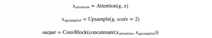 为了解释展开路径的block是如何工作的,让我们把来自前一个block的输入称为g,以及来自扩展路径的skip链接称为x。下面的式子描述了这个模块是如何工作的。