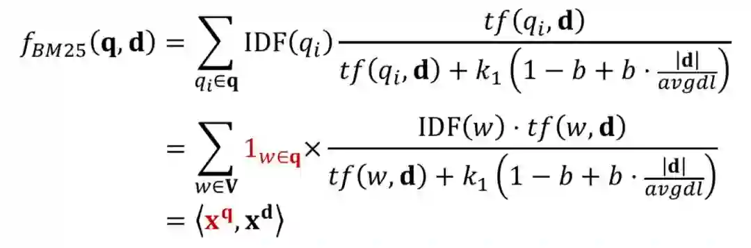 对于第一种方法,基于隐空间的匹配,重点是将query和doc都同时映射到同一空间,经典的模型有BM25。BM25方法核心思想是,对于query中每个term,计算与当前文档doc的相关性得分,然后对query中所有term和doc的相关得分进行加权求和,可以得到最终的BM25,整体框架如图2.4所示