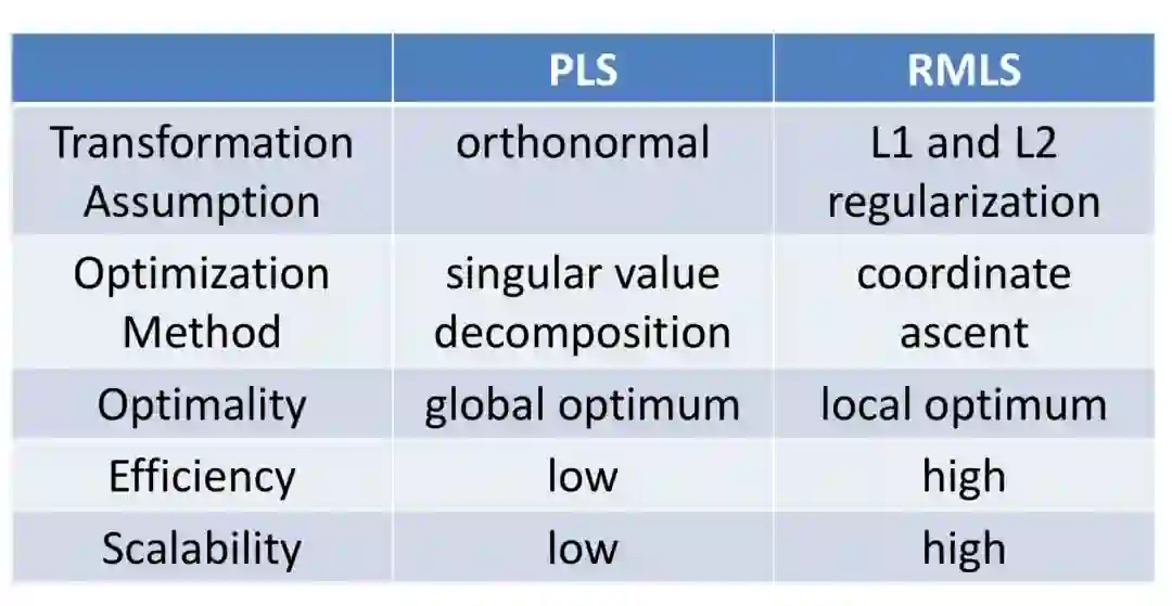 Regularized Mapping to Latent Space和PLS在空间表示、训练数据以及优化目标表示上都一致,区别在于转化矩阵L
