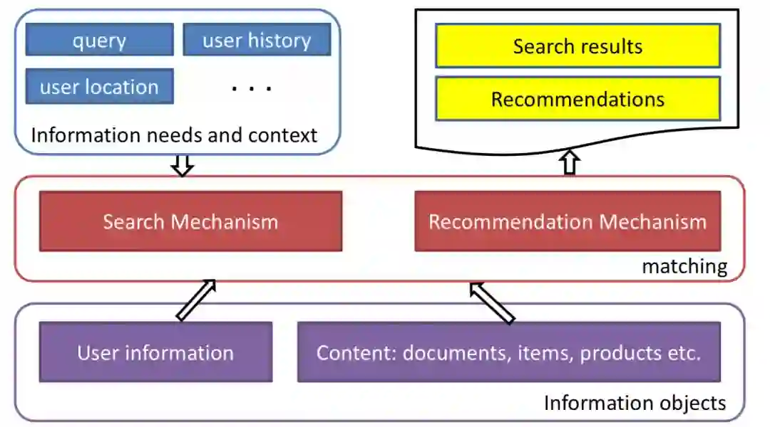 "一文中已经给出了详细的对比,本文不再赘述。在目前工业界的大多数主流系统里,推荐系统和搜索引擎一般分为召回和排序两个过程,这个两阶段过程称呼较多,召回也会叫粗排、触发、matching;排序过程也会叫精排、打分、ranking。