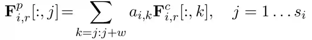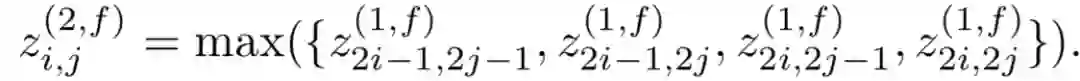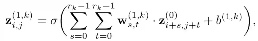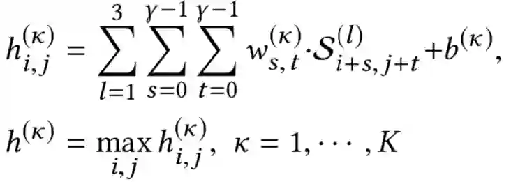 对于输入向量S,引入K个kernel进行卷积表达,每个kernel卷积核大小为γ*γ。对于卷积输出第i,j个元素,其表达为S