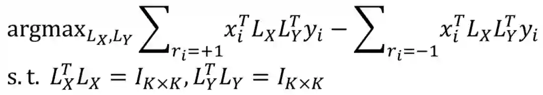 上述用映射后的空间的向量点积作为匹配分数,在求最优化时,目标就是最大化正样本query-doc的pair对,以及负样本query-doc的pair对的向量点击差异,并且满足两个转化矩阵L