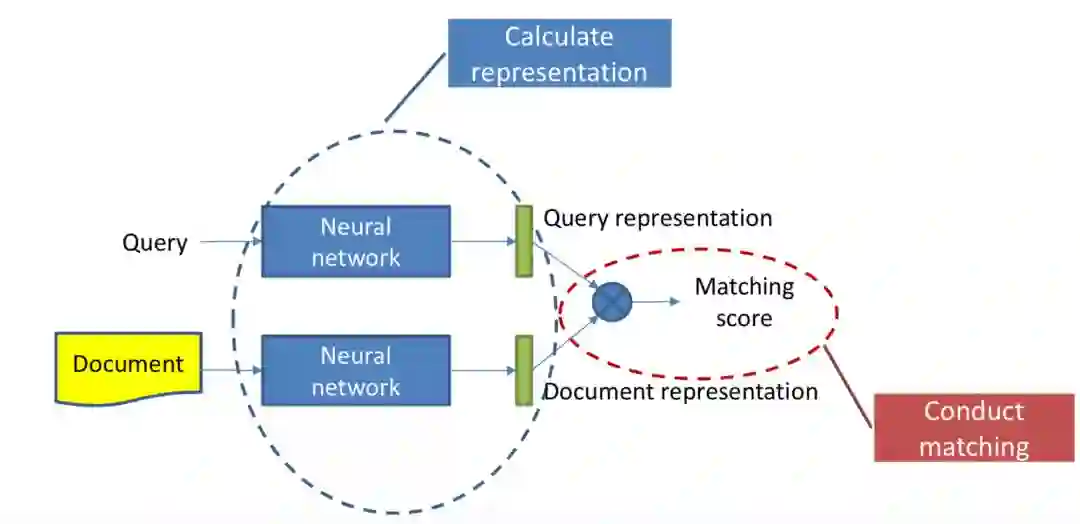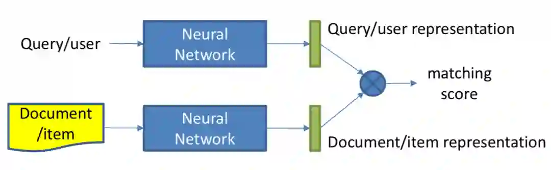 本章主要讲述第一种方法,representation learning,也就是基于表示学习的方法,这种方法会分别学习query和doc ( 放在推荐里就是user和item ) 的representation表示,然后通过定义matching score函数,例如简单点的做法有向量点积、cosine距离等来得到query和doc两者的匹配,整个representation learning的框架如图3.1所示,是个经典的双塔结构: