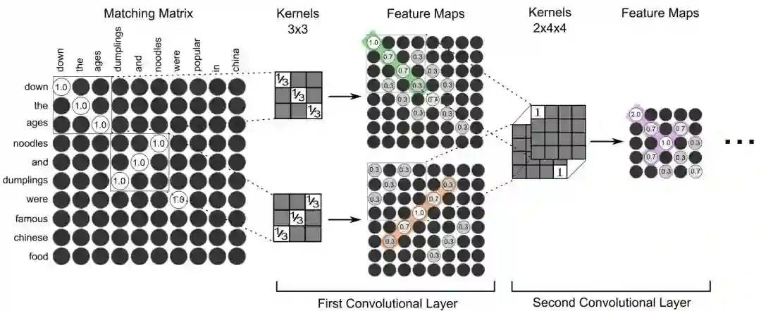 对第二步得到的每一个query-centric contexts以及query对,使用CNN或者2D-GRU的网络及结构提取信息得到匹配分数