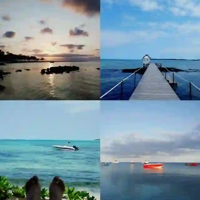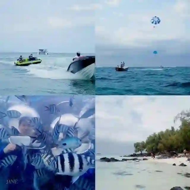 毛里求斯的水上娱乐项目非常丰富,海陆空都有,而且价格合理。海上沙发(下图左上)就是快艇带着你在海上狂奔,海浪拍在脸上,是全程尖叫刺激的海面运动;拖拽伞(下图右上)也是肾上腺飙升的高空运动,飞翔在几十米的高空可以上帝视角一睹毛里求斯的美景;海底漫步就是入海了,像太空人一样在海底观察五颜六色的鱼群,好玩有趣。