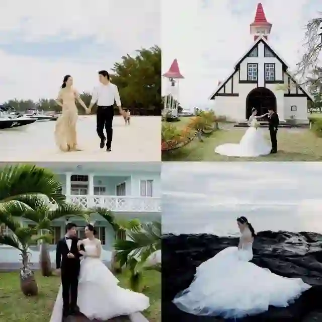 我们定了一个毛里求斯当地的旅拍婚纱照。他们的工作室非常小清新,是一栋粉绿色的别墅(下图左下)。红顶教堂因中国香港演员陈小春和应采儿在此举办婚礼而为国人熟知,红色屋顶,绿色海洋,蓝天白云,非常适合拍婚纱照。毛里求斯风景如画,边拍照边欣赏风景,两不耽误。
