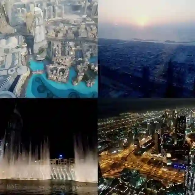 下午5-6点左右是登塔的最好时间,因为白天夜晚景色都可以兼顾。从哈利法塔上俯视迪拜,像极了积木玩具(下图左上),塔上观看渐渐隐去的夕阳也是绝妙的体验(下图右上)。另外,塔底有全球最大的音乐喷泉(下图左下),半小时喷一次,震撼壮观,当天的音乐其中有一首张学友的《吻别》,异国他乡听到熟悉的声音特别亲切。太阳落山后,璀璨的灯光逐渐亮起,勾勒出光彩的城市轮廓,流光溢彩的沙漠不夜城别有一番风味(下图右下)。