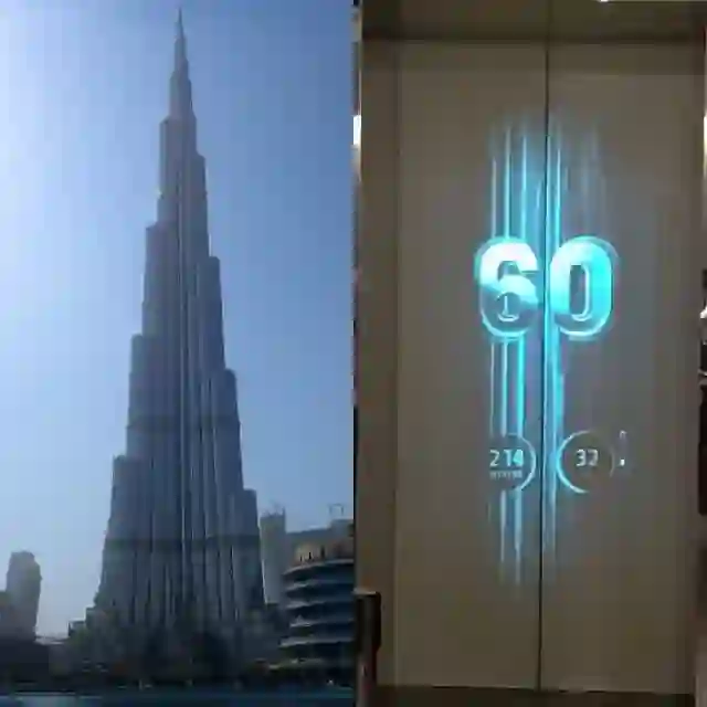 世界第一高楼哈利法塔(下图左)是去迪拜必游景点,到一百多层电梯只需要一分钟,平均每秒9米的速度,如此高速的电梯却非常平稳,电梯上升过程电梯门还有倒计时和楼层数(下图右),满满的科技感。