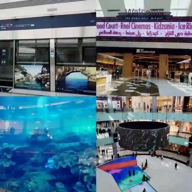 到了迪拜发现这里真的是一个神奇的地方,室内基础设施很好,虽然室外是40°的高温,但是从机场出来坐地铁(下图左上,位于沙漠的迪拜地铁广告却都是海景),走长廊,完全可以在凉爽的室内环境下不出去游览完哈利法塔、迪拜mall(下图右)。作为一个沙漠城市,迪拜mall里还有个超巨大的水族馆(下图左下),而水族馆上面是LED组成的星空图,非常壮观。