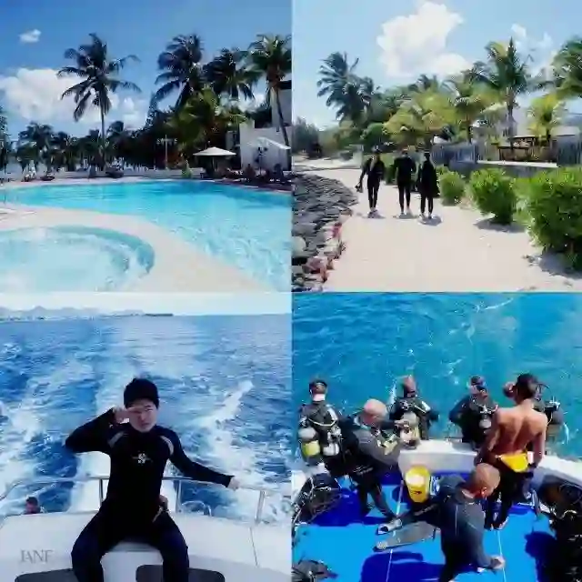 之前去过几个海岛国家浮潜,这次体验一下更刺激的深潜。网上预定的时候说的大概2小时,实际上比较随意,先是在酒店的露天泳池里背着氧气罐练习基本动作和特殊情况处理,然后跟船出海,水下教练一对一还是很安全的,教练会带你在水下近距离观看色彩斑斓的海鱼,珊瑚,还有很多叫不上名字的生物,海底世界太美啦!